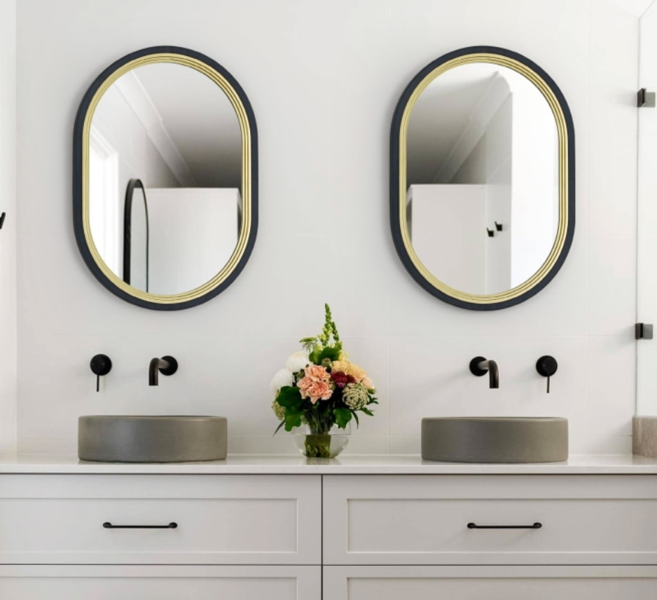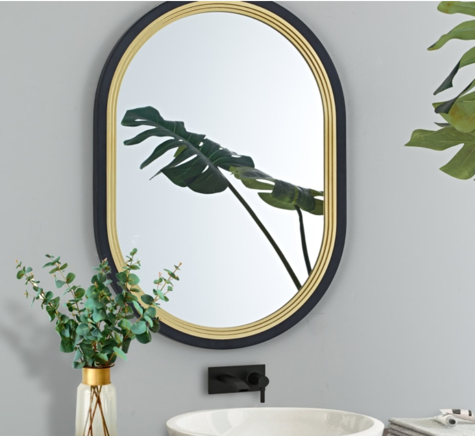 Introducing the Celeste Pill Mirror, a stylish 70 x 60 cm mirror that effortlessly blends modern design with timeless elegance. Its striking pill-shaped silhouette features a matte black outer border paired with a sophisticated gold inner border, creating a luxurious contrast that adds warmth and refinement to any space.