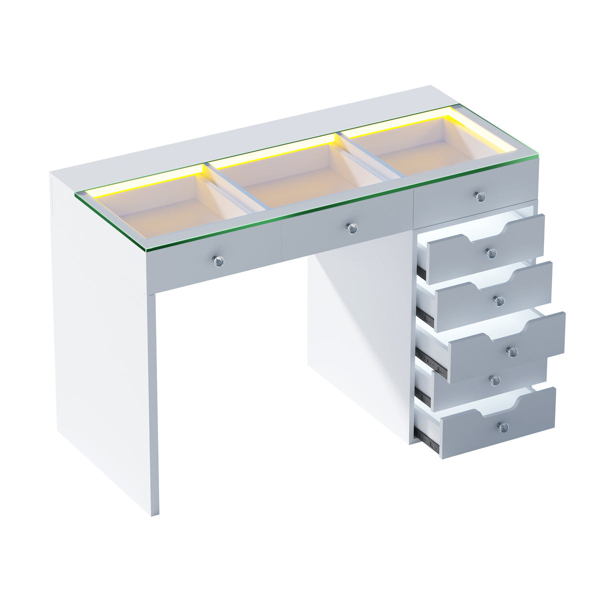 Transform your beauty routine with the VANITII Diana Vanity Desk, designed for elegance and practicality. Featuring 8 spacious storage drawers, a glass tabletop, and a built-in LED light strip, this vanity blends luxury with functionality.