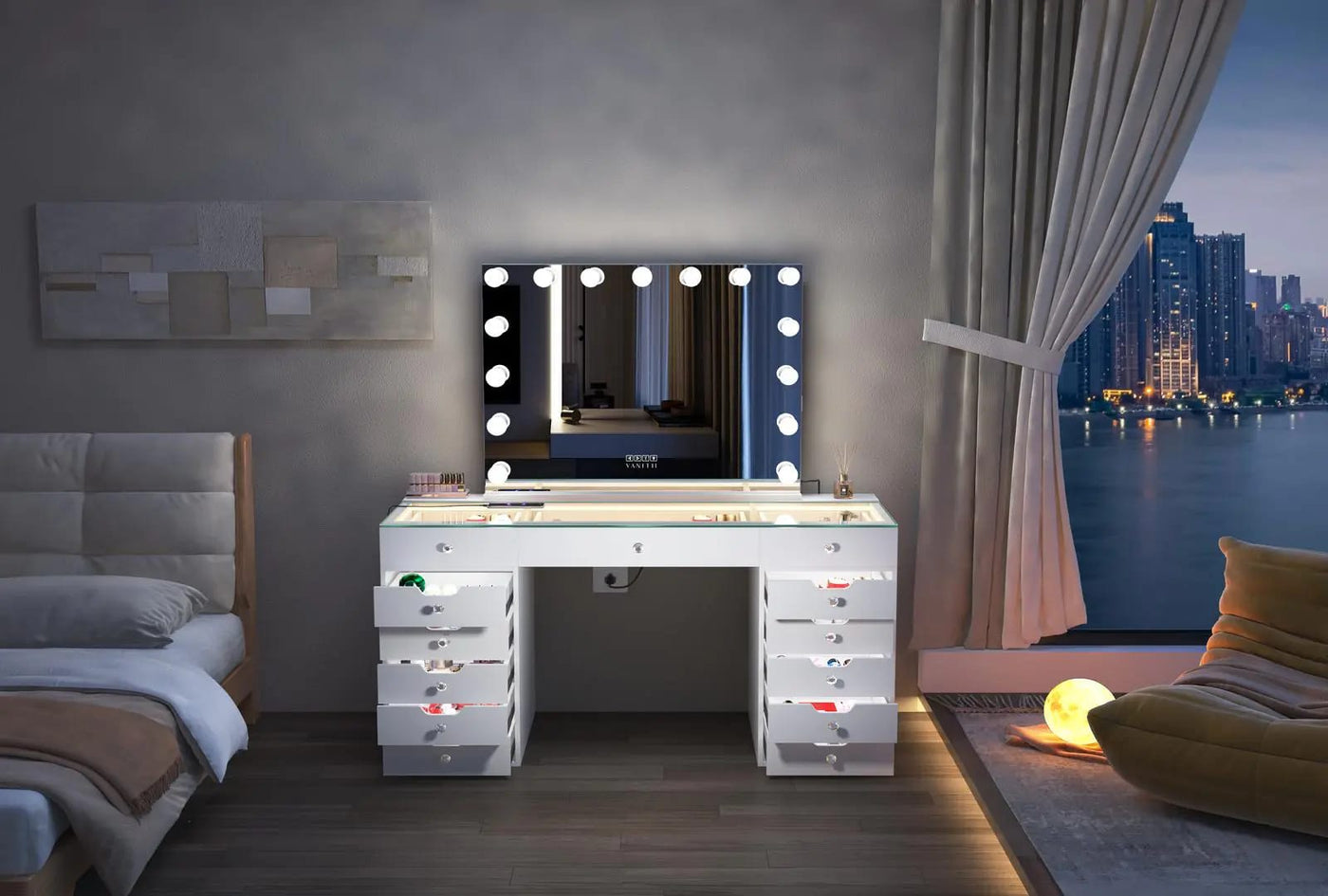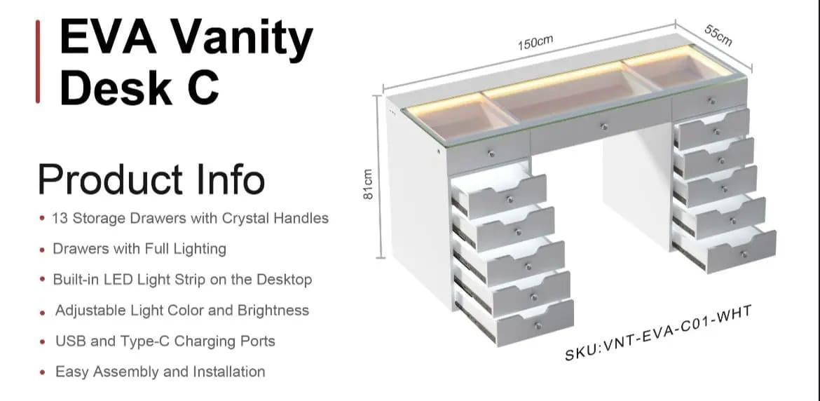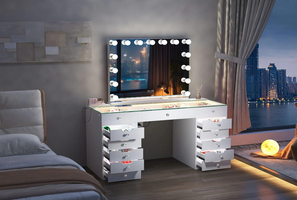 VANITII Eva Vanity Desk & Mirror Set – 13 Storage Drawers with Full Light & RGB